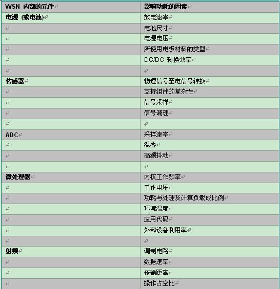 表 1:影響無線傳感器節點功耗的因素