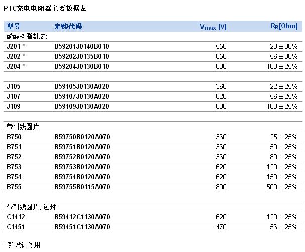 普通電阻在電容充電時常用來限制電流。不過,這常有技術風險。舉例來說,當短接電容器時,如果電容器短路或者繼電器失靈,電阻器將持續暴露在大功率電平下。這可能導致電阻器或者整個系統遭到破壞。愛普科斯采用基于PTC陶瓷的新式J20X系列充電電阻器,現已研發出一種專業解決方案:在自我防護的同時,還實現了相對緊湊的尺寸。如下表所示,J20X系列包括J201、J202和J204產品。