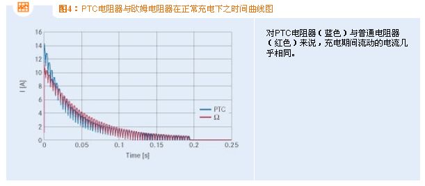 在這兩種情況下,充電電流的時間曲線幾乎相同。PTC陶瓷與固定電阻在電流特性方面的細微差別的產生原因是: