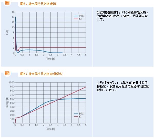 當發生故障時,PTC熱敏電阻用作限流元件的優勢就會十分明顯。如果繼電器接通失敗,負荷電流將流經充電電阻器,并產生強大的熱應力,這要求電阻器有相應的尺寸。若采用基于PTC陶瓷的充電電阻器,其電阻會由于強大的起始功率損耗而升至數10 k,從而能夠在故障發生期間限定電流(參見圖6)。在約三秒之后,先流經兩電阻器然后流經總體電路的電流已跌至數10 mA。有關吸取能量的比較,請參見圖7。