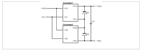 圖3-2為使用Decoupling Diode方式的輸出并聯應用方式,其方式為在二組電源模塊的輸出端,分別串接上二極管,再并聯使用。