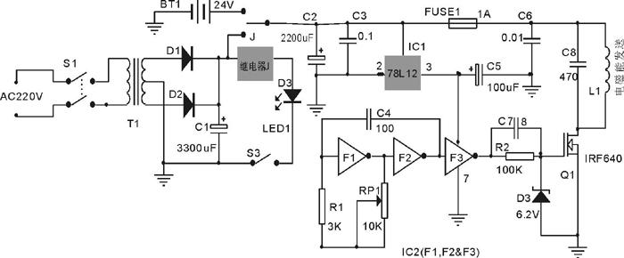 經(jīng)繼電器J選擇的+24V直流電主要為發(fā)射線圈L1供電,此外,經(jīng)IC1(78L12)降壓后為集成電路IC2供電,為保證J的動作不影響發(fā)送電路的穩(wěn)定工作,電容C3的容量不得小于2200uF。