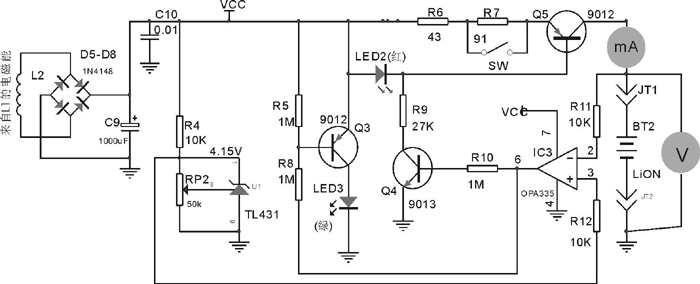 由R4,RP2和TL431構(gòu)成精密參考電壓4.15V(鋰離子電池的充電終止電壓)經(jīng)R12接到運放IC的同相輸入端3。當IC2的反相輸入端2低于4.15V時(充電過程中),IC3輸出的高電位一方面使Q4飽和從而在LED2兩端得到約2V的穩(wěn)定電壓(LED的正向?qū)ň哂蟹€(wěn)壓特性),Q5與R6、R7便據(jù)此構(gòu)成恒流電路I0=2-0.7R6+R7。另一方面R5使Q3截止,LED3不亮。