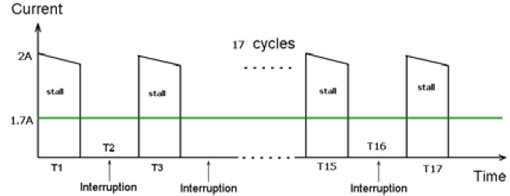 圖6為多功能豆漿機的堵轉電流。在榨水果的堵轉情況下,實測馬達的堵轉最大電流為2A,由于榨果汁時馬達也不是一直連續工作的,也是間隔一定時間工作,間隔時間是馬達工作6S,停3S,這樣換算成在一個榨水果完整工作周期內平均電流是1.6~1.7A。在1.6~1.7A堵轉電流下,馬達堵轉需要保護的時間要求在150S內。