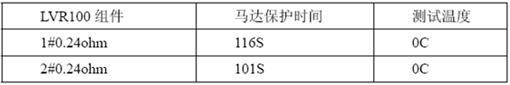 其次選取典型值電阻的LVR100和功率電阻集成的組件,來進行0C/25C溫度下榨水果馬達堵轉保護時間,下表2為馬達的保護時間。
