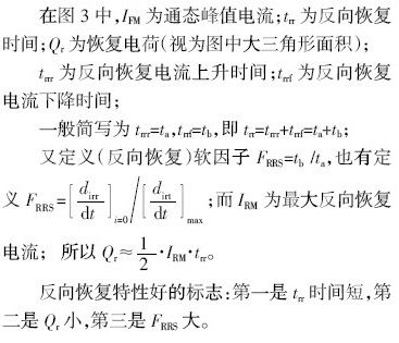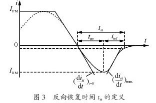 由整流二極管的國(guó)際標(biāo)準(zhǔn)知,反向恢復(fù)時(shí)間trr規(guī)定為:當(dāng)從正向到反向轉(zhuǎn)換時(shí),從電流過零瞬間起,至反向電流由峰值IFM減少到規(guī)定低值瞬間(如圖3 所示)的時(shí)間間隔。