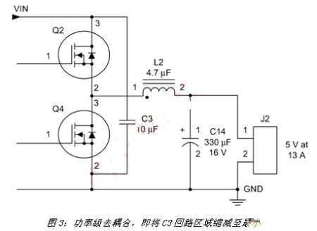在一個電源的正確配置中,必須將大電流導體的回路部分縮減至最小。這樣做能夠將作為天線源和發射能量的電感降至最低。其中一個層面是有效放置元件及選用去耦電容。圖3顯示同步降壓轉換器的輸出功率級與濾波器。C3將功率級去耦合,以便在Q2啟動時提供低阻抗源。為了將輻射發射量降至最低,必須如圖所示連接C3,其中電容的固有阻抗、電路信號線及通過電感的互連均縮減至最小。另外,也需要具有諸如X7R等高自振頻率的高品質電容電介質。