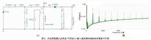 只要加入L2及C2,波形便會變成正弦曲線,而能量會重新調整為相當低的高頻率峰值。不過,如果不能正確設計輸入濾波器,則會將噪聲放大而使得控制回路不穩定。因此,了解濾波器設計的概念,對于優化濾波器回波及成本相當重要。使用SPICE的AC分析是有效了解濾波器行為的工具。