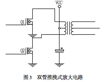 ( 3) 雙管推挽放大電路。圖3所示為雙管推挽放大電路。該方案采用了2 個MOS 管輪流導通,比采用4 個MOS管損耗低,而且輸出電壓比單端方式的要穩(wěn),為達到設計所需要的效率,本文選用了該方案。