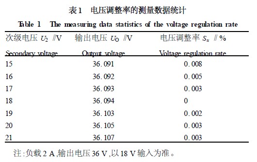 (4) 輸出電壓紋波Vpp。用交流調壓器設定U2 為18 V ,負載電壓為36 V ,電流為2 A 時,用模擬示波器測量紋波電壓峰峰值。