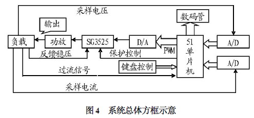 (2) 嵌入式方案。采用51 單片機小系統(tǒng)板對PWM芯片進行控制,并對A/ D 和D/ A 進行控制和采樣。采用以7279 為核心的按鍵掃描顯示模塊進行鍵控和顯示。該方案編程比較容易,控制很方便,顯示也很容易實現(xiàn)。經(jīng)綜合比較考慮,筆者選擇采用嵌入式解決方案。