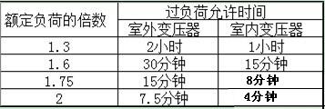 過負(fù)荷運行是指變壓器運行時超過了銘牌上規(guī)定的電流值。過負(fù)荷分為正常過負(fù)荷和事故過負(fù)荷兩種,前者是指在正常供電情況下,用戶用電量增加而引起的,它往往使變壓器溫度升高,促使變壓器絕緣老化,降低使用壽命,所以不允許變壓器過負(fù)荷運行。特殊情況下變壓器短時間內(nèi)的過負(fù)荷運行,也不能超過額定負(fù)荷的30%(冬季),在夏季不得超過15%。對后者,事故過負(fù)荷與允許過的時間要求見下表。