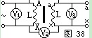 把初級線圈和次級線圈的一對同名端,例如Aa,用導(dǎo)線接起來,如圖38所示。然后在AX初級線圈間拉入交流電(比較低的便于測量的)。用電壓表分別測 量AX間電壓V1值,XX間電壓V2值,以及ax間電壓V3值。如果V2數(shù)值是V1與V3電壓之差,則Aa是同極性端,如果V2數(shù)值是V1與V3電壓之和,則AX是同極性端。