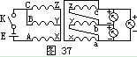 測單相變壓器時,如圖36所示,在初級線圈一側(cè)拉入一個1.5伏的干電池,然后在次級線圈拉入一直流毫伏表。當(dāng)合上開關(guān)K的一瞬間,表針朝正方向擺動(或拉開開關(guān)時表針向負(fù)方向擺),說明接電池正極一端是同極性,或叫同名端。測試三相變壓器的極性和級別,多采用直流法進(jìn)行。測試方法為:在初級線圈側(cè)接上干電池和開關(guān)K,先在A端接電池正極,B端接電池負(fù)極,再在次級線圈a、b、c之間拉入三個毫伏表,如圖37所示,