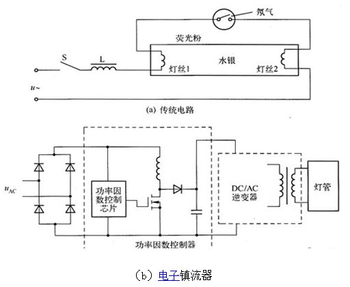我們知道,最普通的熒光燈的起輝是采用一個串聯的鐵芯電感和一個并聯的起輝器(圖3a)。對于這種電路在用LED日光燈直接替換時,只要拔掉起輝器就可以了。但是由于鐵芯電感仍然串聯在電路中,所以它仍然帶來將近6.4W(Philip)到10W(國產)的損耗,結果由于這部分的額外損耗就大大降低了LED的節電功效。