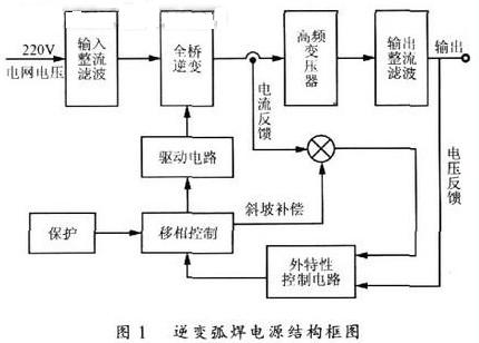 220V交流市電經整流濾波后做為全橋逆變器的直流輸入,其輸出為脈寬可調的高頻交流電壓方波,通過高頻變壓器隔離降壓后,再經過輸出整流濾波得到滿足焊接要求的直流電源。