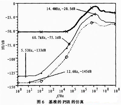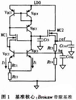 電子鎮(zhèn)流器的供電方式為半橋輸出接穩(wěn)壓管給芯片供電,其輸出電壓為高壓正弦波(50~100 kHz),加之芯片內數(shù)字部分的干擾,這就給芯片的電源帶來較大的干擾。因此對芯片內基準的中頻PSR(Power Supply Rejection,電源抑制)有較大要求。本文從此角度在Brokaw帶隙基準的基礎上進行改進,采用LDO與基準的級聯(lián)設計來增加其PSR。