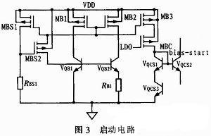 這樣雖然能啟動,但是,正常工作時,此大啟動電流bias-start將通過VQCS1和VQCS3流向地,增加了系統(tǒng)的負擔。因此,在電流輸出管MB3下加入控制管MBC,并使得在正常工作時,LDO的高電壓足以使MBC關斷,從而降低啟動電路的損耗。