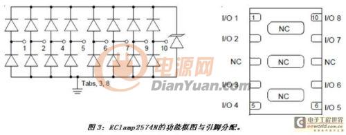 升特公司的最新以太網(wǎng)保護方案RClamp2574N可滿足并超過所有上述要求。建議將其放置于變壓器的PHY端,盡可能靠近磁體。RClamp2574N可配置為保護一個千兆以太網(wǎng)的全部四對差分線對。如圖3所示,八個I/O引腳中的每一個都有一個低電容的控向二極管對,該器件用來將有害的浪涌電流引入內部的低壓TVS二極管。控向二極管的工作電壓僅有2.5V,采用升特公司專利的EPD工藝技術制造。低壓導通是一個很重要的保護參數(shù),因為很多PHY芯片都集成了ESD保護結構。這些結構并非針對承受很大的電能而設計。如果它們在外部保護實