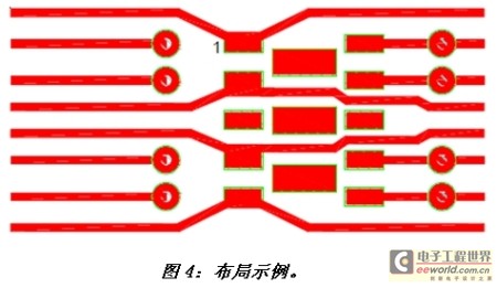 圖4顯示了RClamp2574N的流通型PCB走線。信號線連接到第1、2、4、5、6、7、9和10腳。第3腳與8腳連接到三個中心接地。在一個典型以太網(wǎng)應用中,這些引腳以及接地都應懸空(即不接地)。在本例中,走線寬度為0.005英寸。過孔用于第6、7、9和10腳的換層連接,這樣所有八根信號線都可采用易于實現(xiàn)的流通型(flow though)布局。