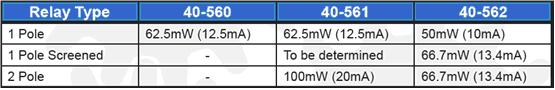 不同類型的繼電器功耗列表如下。