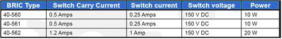 下表中所示的是BRIC模塊中不同的開關(guān)類型的不同額定值