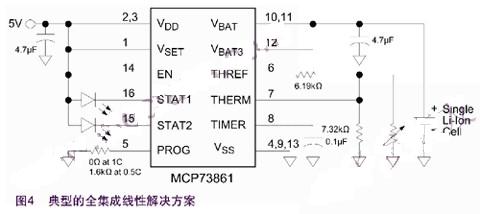 基于Microchip MCP73861的全集成線性解決方案如圖4所示。MCP73861包含了MCP73843的所有功能,另外還包括電流檢測、傳輸晶體管、反向放電保護以及電池溫度監(jiān)測。