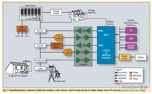 片上集成恰當的控制外設以及高模擬集成度是保證系統低成本的兩個基本要素。為執行針對優化轉換、系統監控和能量存儲各環節中的效率所開發出的算法,高性能也是必需的。
