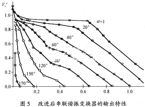 圖4中最大的功率曲線(α=1)即對(duì)應(yīng)于變換器開環(huán)工作,圖4中停留在底部的曲線是對(duì)應(yīng)于輕載的情況。工作在歸一化的輸出電流I*o=0.15%且ψ=1時(shí),結(jié)果產(chǎn)生大約30%的過壓。改進(jìn)變換器的輸出特性為雙斜率輸出特性,使電路提高了電壓、電流限制的固有能力,改善了高壓電源的空、滿載的適應(yīng)性,同時(shí)有利于高壓電源寬范圍的輸出調(diào)節(jié)。