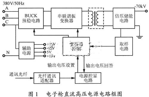 電子槍直流高壓電源采用380V/50Hz三相四線輸入,最高輸出直流電壓為負(fù)極性70kV,電源長期運(yùn)行工作為-60kV左右,在滿足穩(wěn)定度要求條件下,輸出直流高壓電壓的連續(xù)可調(diào)范圍不小于-40~-70kV。