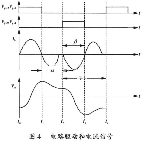 電路的諧振槽路的電流波形和驅(qū)動(dòng)信號(hào)波形如圖4所示,通過調(diào)節(jié)α角控制變換器的輸出功率。