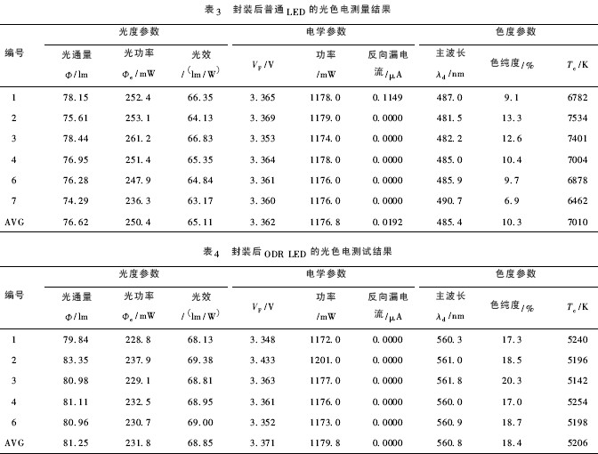 對封裝后的樣品選取普通LED 和ODR LED 各7個,兩類LED中不同樣品各自編號,先進行LED的快速光色電測試,測試儀器為杭州遠方HAAS- 2000 LED 快速光色電綜合測試量系統,測試溫度為25℃,測試電流為350 mA,兩組LED 的測試結果如下,表3 中去除5 號、表4 中去除5 號和7 號等性能不佳的樣品,兩組樣品測量反向漏電流時的反向電壓均為- 5. 008 V.