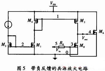 為構(gòu)建負反饋方法改善PSRR,對一種帶有負反饋的共源放大電路進行了仿真,并與圖1中仿真的不帶負反饋的共源放大器進行了比較。負反饋的電路如圖5所示,輸出電壓被采樣并控制M6,由M6的電流通過R0轉(zhuǎn)換為電壓,輸出電流及M0的輸入電流混合構(gòu)成。負載器件是PMOS管,其偏置電壓由一鏡像電路產(chǎn)生。在設(shè)計過程中,其電阻值是關(guān)鍵,因為它決定著增益和PSRR值之間的平衡。電阻值過大會損失增益。