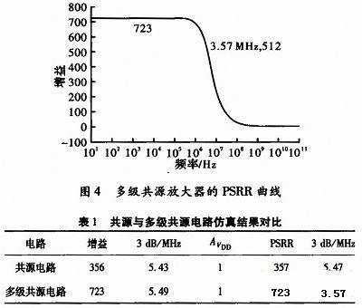 通過使用消除電源波動影響的附加電路,改善了PSRR。但由于輸出阻抗上附加電路的影響,整個電路的增益依然有待于改變。從上述結(jié)果看,整個電路將獲得一個增益與PSRR的平衡。