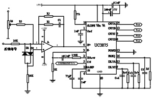 PWM移相控制是通過UC3875的誤差放大器來實(shí)現(xiàn)的,在UC3875的4角上接PI調(diào)節(jié)器,利用電壓傳感器將輸出電壓與給定基準(zhǔn)電壓相比較,從而控制A、B與C、D之間的相位,最終調(diào)整波形占空比,使電源穩(wěn)定在預(yù)定值上。A/B、D/C兩個(gè)半橋,可單獨(dú)進(jìn)行導(dǎo)通延時(shí)(即死區(qū)時(shí)間)的控制,在該死區(qū)時(shí)間內(nèi)確保下一個(gè)功率開關(guān)器件的輸出電容放電完畢,為即將導(dǎo)通的開關(guān)器件提供電壓開通條件。圖3所示是本設(shè)計(jì)的控制電路圖。