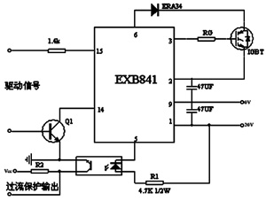 隨著IGBT在各類變流裝置中的廣泛應(yīng)用,IGBT驅(qū)動(dòng)模塊的選擇及其性能越來越引起使用者的重視。理想的驅(qū)動(dòng)模塊除了應(yīng)為IGBT提供足夠的開通和關(guān)斷柵壓外,還應(yīng)具備迅速、可靠的保護(hù)功能,同時(shí)力求電路簡單、穩(wěn)定。IGBT的常用驅(qū)動(dòng)模塊有許多種,其中EXB系列應(yīng)用最廣。EXB841驅(qū)動(dòng)模塊廣泛應(yīng)用于開關(guān)電源、UPS、電力傳動(dòng)及電力補(bǔ)償?shù)阮I(lǐng)域。圖4所示是本設(shè)的IGBT的驅(qū)動(dòng)電路圖。