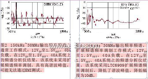LTC6909上的擴(kuò)展頻譜頻率調(diào)制通過連續(xù)改變μModule的時鐘頻率,強(qiáng)制輻射能量分散開以改善EMI,防止該能量停留在任何接收器頻帶內(nèi)。μModule開關(guān)輻射的紋波是產(chǎn)生不需要的頻譜諧波的罪魁禍?zhǔn)住TC6909擴(kuò)展頻譜頻率調(diào)制功能通過一個偽隨機(jī)噪聲信號,將能量擴(kuò)展到一個寬的頻帶上,從而降低峰值電磁輻射,以降低諧波幅度。