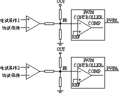 通過檢測RC網(wǎng)絡(luò)中C兩端的電壓,作為電流信號,幾路電流信號(本例只有兩路)通過一個(gè)相同的電阻就得到了平均值均流母線,平均值均流母線電壓值與負(fù)載有關(guān),表征負(fù)載電流的大小。然后將每路采樣來的電流信號與母線電壓比較,得到誤差信號,去修正輸出電壓參考信號,從而對PWM控制器的占空比輸出進(jìn)行微調(diào),達(dá)到均流和穩(wěn)壓的目的。