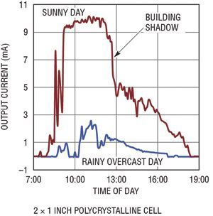 用光伏電池可產生多少功率取決于多種因素。電池的輸出功率與投射到電池上的光強度、電池的總面積以及電池的效率成正比。大多數光伏電池都規定在完全直射的太陽光 (1000W/m2) 下使用,但是在大多數應用中,不可能有這么理想的條件。就依靠太陽光工作的設備來說,可從電池獲得的峰值功率可能非常容易變化,由于天氣、季節、煙霧、灰塵和太陽光入射角的變化,今天與明天相比有可能相差10倍。在充足的太陽光照下,晶體電池視電池特性的不同而有所不同,典型輸出功率約為每平方英寸40mW。面積為幾平方英寸的光伏電池足夠給多個遠程傳感器供電以及給電池涓流充電了。