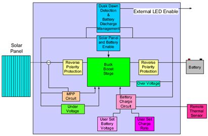 在白天時(shí)間系統(tǒng)對(duì)電池充電,而在夜間電池放電照亮定義的空間。雖然輸入能量不能保證,但輸出能量可在相當(dāng)長的時(shí)間保持不變。如果一個(gè)系統(tǒng)的大小不合適,電池可能因放電而損壞。要防止電池?fù)p壞,必須用LED電路抑制操作,防止電池耗盡。