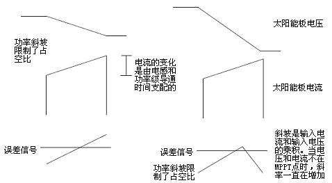 為了從功率可變的電源(即太陽能電池板)析取出最大的功率,太陽能控制器必須采用MPPT。MPPT必須首先找到最大功率點(diǎn)并及時(shí)調(diào)整環(huán)境條件,以保持控制器接近最大功率點(diǎn)。動(dòng)態(tài)MPPT用在系統(tǒng)發(fā)生改變的情況下。由于每個(gè)開關(guān)周期都在發(fā)生變化,太陽能電池板汲取的功率也會(huì)在每個(gè)周期有明顯的改變。動(dòng)態(tài)MPPT利用太陽能電池板的電壓驟降乘以每個(gè)開關(guān)周期增加的電流,以確定將要產(chǎn)生的誤差信號(hào)來調(diào)節(jié)占空比。動(dòng)態(tài)響應(yīng)可檢測IV曲線的斜率,從而建立一個(gè)功率斜坡,從誤差信號(hào)相交點(diǎn)建立一個(gè)代表占空比的功率。當(dāng)斜坡變化斜率從正到負(fù)時(shí)該周期結(jié)束,如圖2所示。