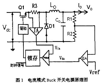 開關(guān)電源可以有很多種結(jié)構(gòu),但原理基本相似。圖1是電流模式降壓斬波fg(Buck)開關(guān)電源的原理圖。它和電壓模式的主要區(qū)別是增加了電流采樣電阻R3和電流放大器IA. R3的阻值一般很小,以避免大的功耗。功率管Ql在每個(gè)周期開始的時(shí)候開啟并維持一段時(shí)間Ton,通過濾波電感Lo對(duì)濾波電容C。充電、同時(shí)向負(fù)載提供電流,此時(shí)Lo上電流隨時(shí)間的變化率為