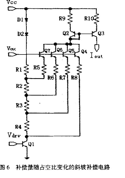 因?yàn)?Q4 ,Q5,Q 6和Q7是先后開啟的,所以補(bǔ)償電流在時(shí)間軸上的斜率dlout/dt將隨著Vosc的增大而增大,即斜坡補(bǔ)償?shù)牧侩S占空比增大而增大。