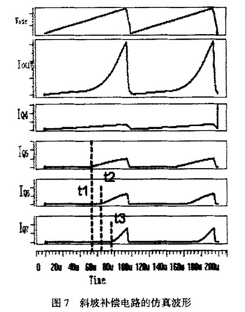 圖7是在選取了元件尺寸后計(jì)算機(jī)仿真波形。其中Vosc是理想化的鋸齒波,Iout是輸出的補(bǔ)償電流,IQ4、IQ5、IQ6、 IQ7分別是Q4, Q5, Q6和Q7的漏極電流,可以看到,為了在占空比小于50%的時(shí)候系統(tǒng)更加穩(wěn)定,Q4在每個(gè)周期開始時(shí)就已經(jīng)開啟,但是電流的斜率較小。隨著Vosc以恒定的斜率上升,將先后在t1, t2, t3時(shí)達(dá)到Q5, Q6和07的開啟點(diǎn)。設(shè)Q4, Q5, Q6, Q7開啟后的電流斜率分別為m4, m5, m6和m7,