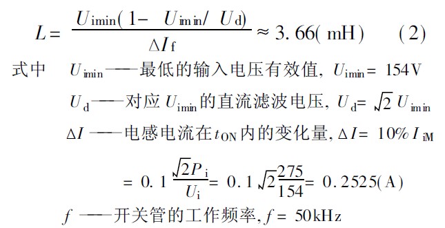 我們設計開關管的工作頻率為50kHz, Rt= 11. 2kΩ , C t= 2. 2nF, 輸入電壓Ui 范圍為220V+ 20%- 30%, 直流電壓Ud = √2Ui, DC/ DC 的輸出功率為250W, 輸入功率為275W, 效率η=91%, 根據公式計算校正電感: