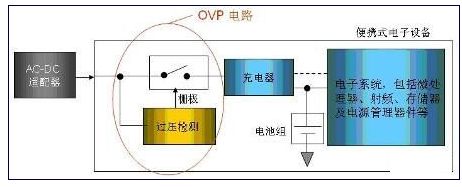 根據(jù)YD/T 1591-2006標(biāo)準(zhǔn),手機(jī)側(cè)充電控制電路應(yīng)具備過壓保護(hù)裝置,也就是在手機(jī)充電接口導(dǎo)入直流6 V以上電壓時(shí),如果不能保證安全充電,應(yīng)啟動(dòng)保護(hù),在非預(yù)期電壓的情況下,不應(yīng)出現(xiàn)過熱、燃燒、爆炸以及其它電路損壞的現(xiàn)象,而且恢復(fù)后,手機(jī)應(yīng)能正常工作。如圖4所示,過壓保護(hù)(OVP)電路在檢測(cè)到過壓故障狀況時(shí),檢測(cè)電路就會(huì)將開關(guān)打開,使電子負(fù)載與電源斷開,從而使得包括微處理器、射頻、存儲(chǔ)器和電源管理器件等核心芯片遭受過壓損傷。