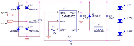 該應(yīng)用電路的工作原理并不復(fù)雜,是一個(gè)簡單的降壓轉(zhuǎn)換器。在交流應(yīng)用情況下,輸入經(jīng)整流橋進(jìn)行整流。VBAT和GND直接連接至大容量電容C1的兩個(gè)端點(diǎn),從而降低了電流紋波。在第一開關(guān)相位期間,內(nèi)部MOSFET隨線性上升電流對電感器充電,直到MOSFET關(guān)閉;在第二相位期間,MOSFET被關(guān)斷,而儲(chǔ)存在電感器中的電流將通過肖特基二極管(D5)放電,同時(shí)電流衰減,直至下一個(gè)開關(guān)周期。輸出電容用來減少LED中的電流紋波。RSET引腳的電壓被調(diào)節(jié)在1.2 V,因此連接至RSET的電阻決定RSET電流。RSET電流與CAT4201的恒流輸出大致成正比。