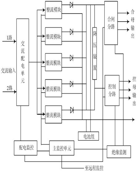 智能高頻開關(guān)電源系統(tǒng)的總體結(jié)構(gòu)主要由主監(jiān)控單元、配電模塊、交流配電單元、整流模塊等組成, 系統(tǒng)總體的結(jié)構(gòu)圖如圖1 所示。系統(tǒng)中的各個(gè)監(jiān)控單元受主監(jiān)控單元的管理和控制, 通過通信線將各個(gè)監(jiān)控單元采集的信息送給主監(jiān)控統(tǒng)一管理。主監(jiān)控顯示直流系統(tǒng)各種信息, 用戶也可以觸摸顯示屏查詢信息及操作,系統(tǒng)信息還可以接入到遠(yuǎn)程監(jiān)控系統(tǒng)中。系統(tǒng)除了交流監(jiān)控、直流監(jiān)控、開關(guān)量監(jiān)控等基礎(chǔ)單位外, 還配置了絕緣監(jiān)測(cè)、降壓裝置、電池巡檢等功能單元, 以達(dá)到對(duì)直流系統(tǒng)進(jìn)行全面監(jiān)控的目的。
