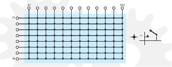 實現開關切換的一個比較通用的方法就是采用交叉點開關或矩陣排列來實現。在矩陣開關中,一系列的橫向(X軸方向)和縱向(Y軸方向)線路在每個交叉點上相互連接著。開關最簡單的結構是,在通常的狀態下是常開的,而在上電后則斷開連接,形成閉合狀態,但是,也可能存在其他的結構。開關允許矩陣中任何橫向線路與縱向線路在任意點的連接。
