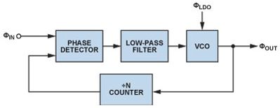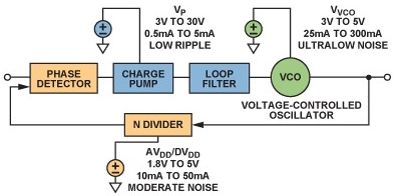 鎖相環(PLL)是現代通信系統的基本構建模塊PLLs通常用在無線電接收機或發射機中,主要提供"本振"(LO)功能;也可用于時鐘信號分配和降噪,而且越來越多地用作高采樣速率模數或數模轉換的時鐘源。由于每一代PLL的噪聲性能都在改善,因此電源噪聲的影響變得越來越明顯,某些情況下甚至可限制噪聲性能。本文討論圖1所示的基本PLL方案,并考察每個構建模塊的電源管理要求。